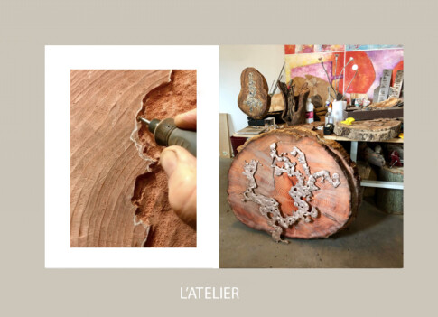 J’ai alors choisi d’explorer un autre univers créatif : celui de la sculpture. L’aspect brut et primaire du bois allié à la préciosité de mes bijoux m’a permis de donner une autre dimension à ces deux éléments. Ces oppositions de matières sont un vrai signe distinctif de mes créations. Je sélectionne le bois pour ses dessins, ses veines, sa couleur, sa chaleur, et au-delà de tout, sa sensualité. Je me laisse guider par ses qualités pour sublimer sa forme et y incruster des fragments de mes bijoux. Ces derniers sont et resteront mon point de départ, ma marque de fabrique, mon histoire.