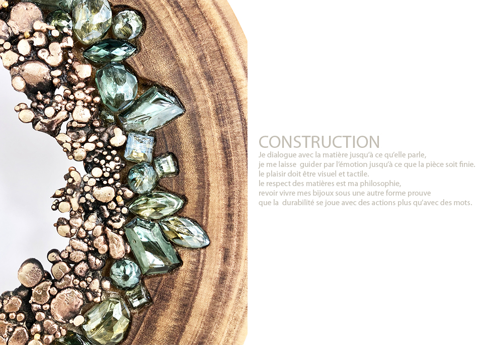 J’ai alors choisi d’explorer un autre univers créatif : celui de la sculpture. L’aspect brut et primaire du bois allié à la préciosité de mes bijoux m’a permis de donner une autre dimension à ces deux éléments. Ces oppositions de matières sont un vrai signe distinctif de mes créations. Je sélectionne le bois pour ses dessins, ses veines, sa couleur, sa chaleur, et au-delà de tout, sa sensualité. Je me laisse guider par ses qualités pour sublimer sa forme et y incruster des fragments de mes bijoux. Ces derniers sont et resteront mon point de départ, ma marque de fabrique, mon histoire.
