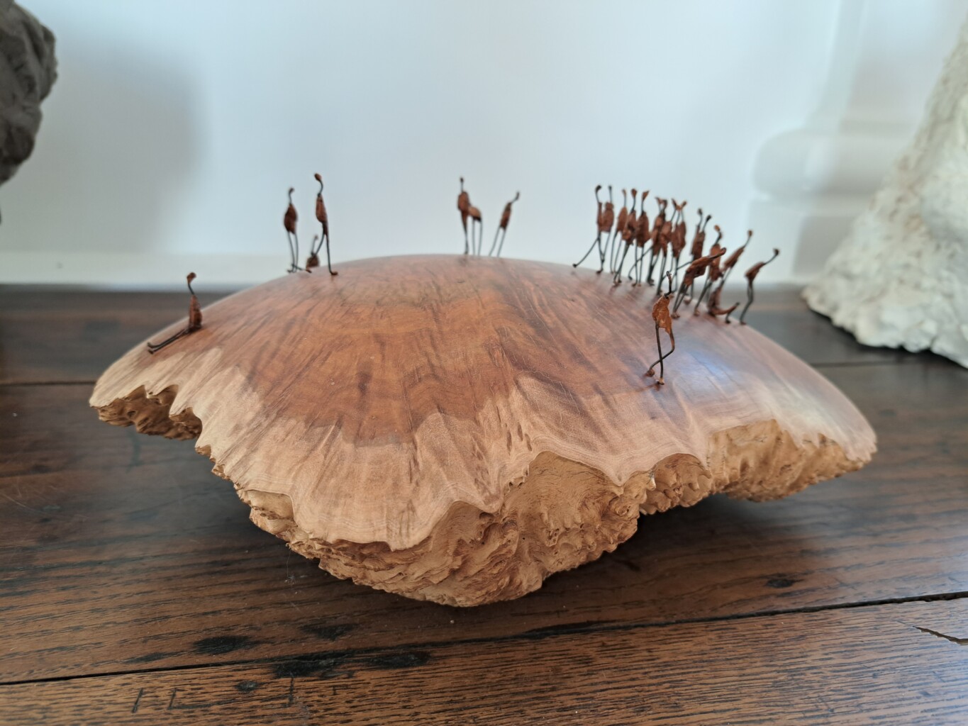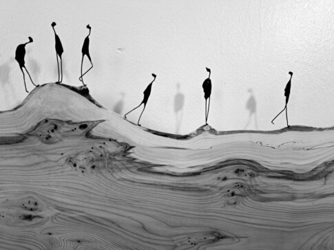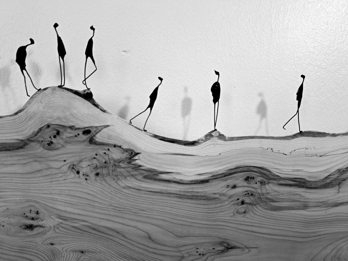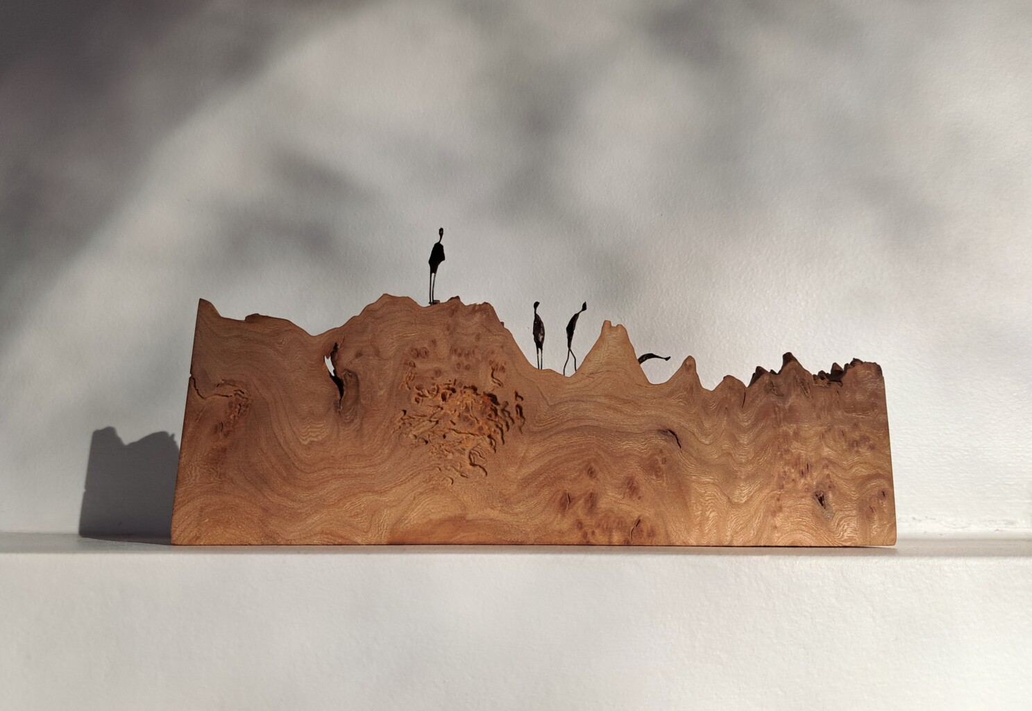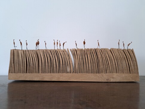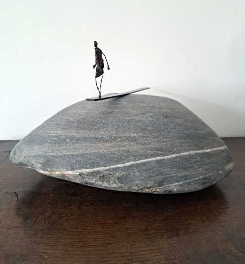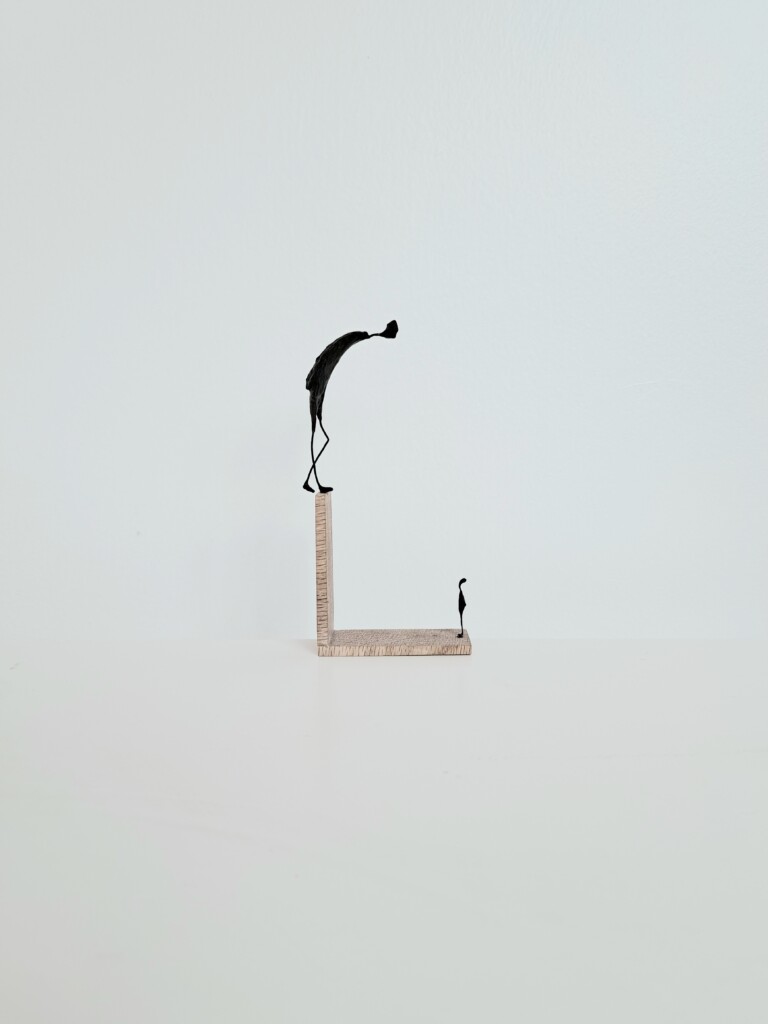 J’esquisse des silhouettes simples, épurées, presque silencieuses, que je mets en scène sur des supports variés. J’aime explorer les matériaux – le bois, le métal, le papier, la terre, le verre – pour en révéler la texture, la souplesse ou la rugosité. Ce sont des compagnons de travail qui me permettent de traduire une émotion, un instant, un état d’âme.