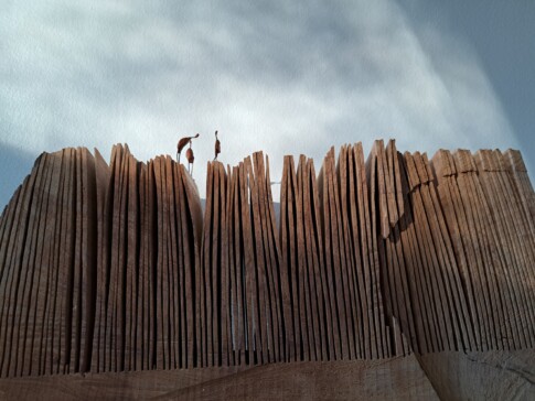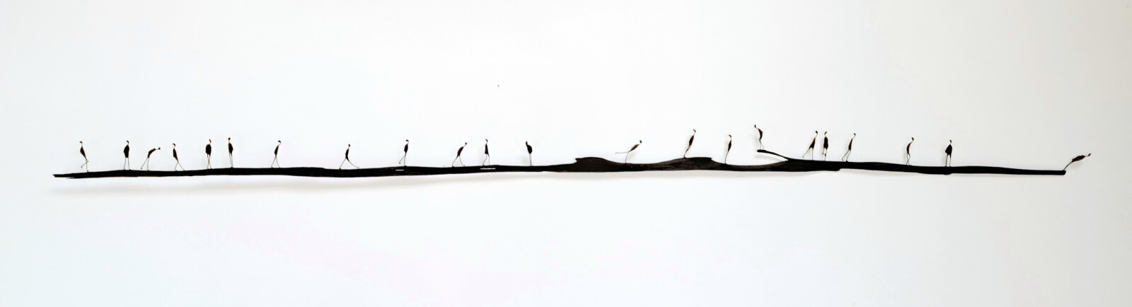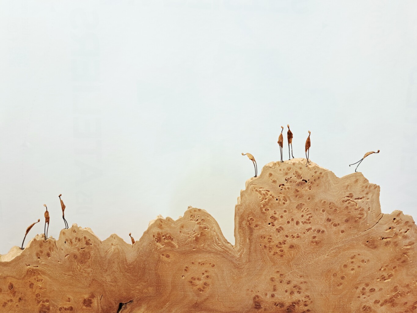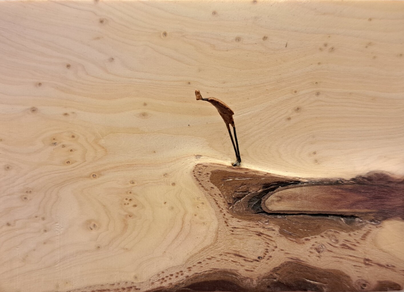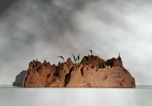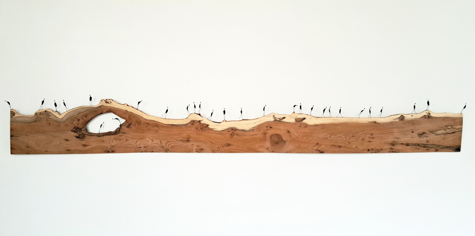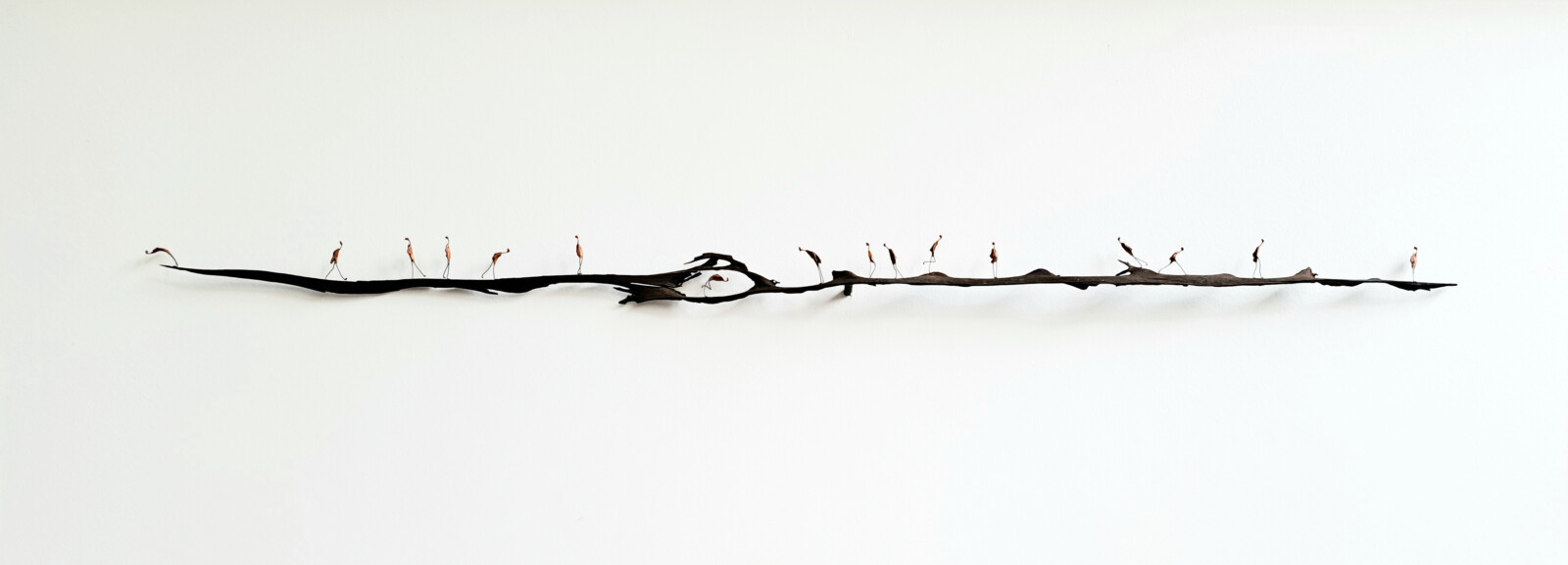J’esquisse des silhouettes simples, épurées, presque silencieuses, que je mets en scène sur des supports variés. J’aime explorer les matériaux – le bois, le métal, le papier, la terre, le verre – pour en révéler la texture, la souplesse ou la rugosité. Ce sont des compagnons de travail qui me permettent de traduire une émotion, un instant, un état d’âme.