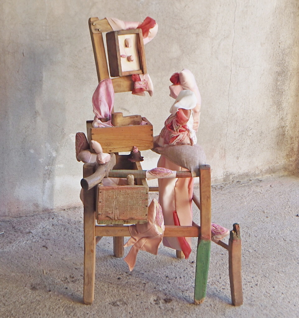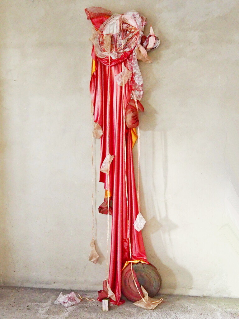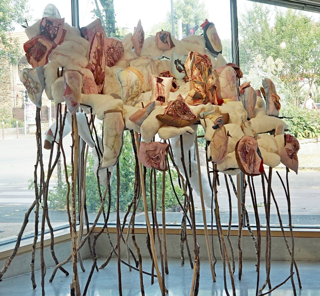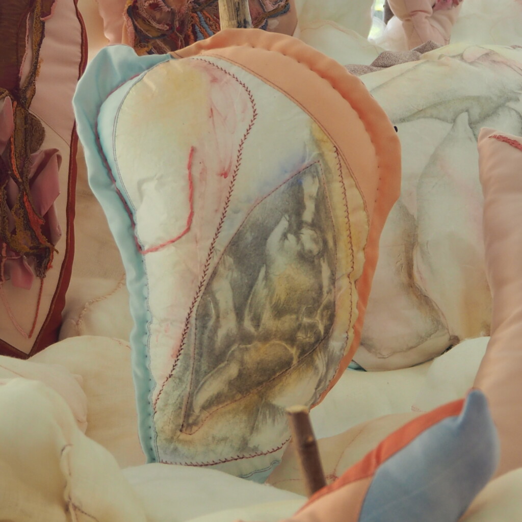 Transformer, disséquer, réaménager, reformuler et déconstruire une mythologie des corps pour leur attribuer une autre géographie. Imprimer des surfaces, les enfoncer, extirper, soulever… enfin pouvoir respirer. Exit la légende de l’être premier, séparé. Exit le mythe de l’incomplétude. Exit le miroir négatif du pénis nommé vagin, reflétant l’image d’un trou béant attendant son comblement. Exit l’idée de disponibilité du corps des femmes. J’imagine d’autres emboîtements, je rêve de migrations, de frontières perméables. Je rêve d’échapper aux visions binaires du monde. J’aimerais déjouer les rapports de domination. Mes oeuvres ne sont pas des bannières, elles renforcent ma perception de sujet, elles sont comme mon corps, vectrices de significations, médiatrices de relation aux autres et à soi. Quoi de plus évident que du textile pour rendre compte des corps vécus, éprouver son existence incarnée, rendre compte d’une liberté sous contraintes…? Aller du dedans vers le dehors et en faire surfaces. Construire une enveloppe peau soulevée par l’empreinte des organes, bornant des territoires sexuels illimités. Examiner les interactions entre les organes intérieurs et extérieurs et estampiller les indéterminismes. Aller du dehors vers le dedans sans exproprier. Aller du volume mou, répandu ou tenu, contraint, vers des surfaces semblant tisser, à l’aquarelle et aux traits, des représentations altérées et en échos, contribue à éprouver une existence incarnée au sein d’une réalité collective de discriminations.