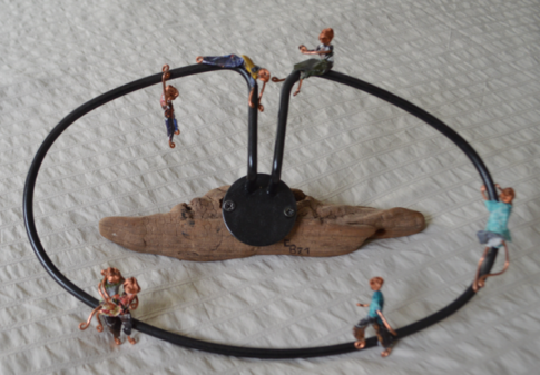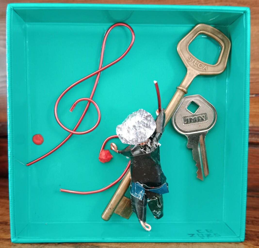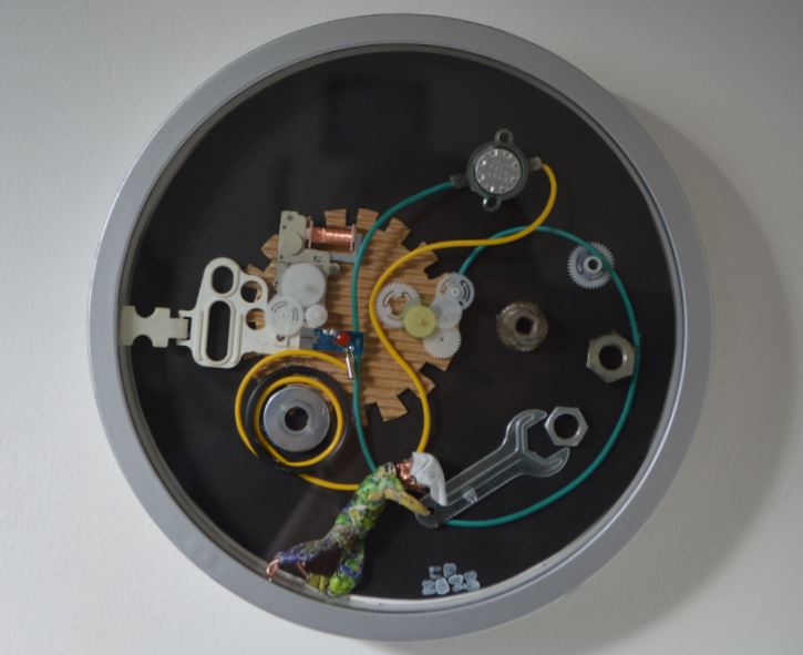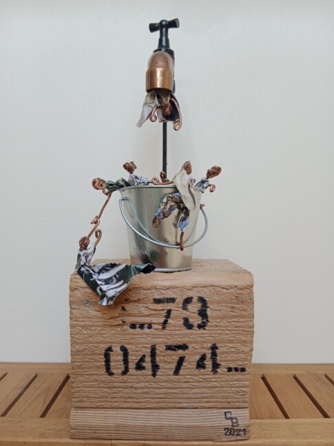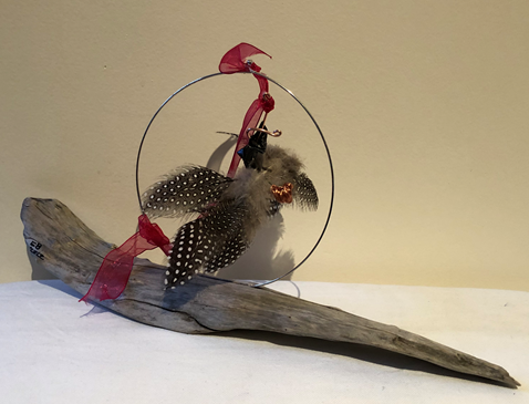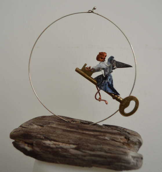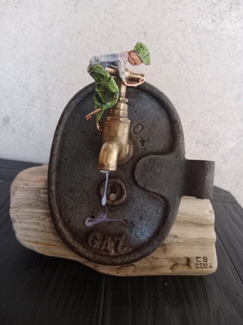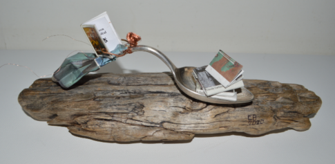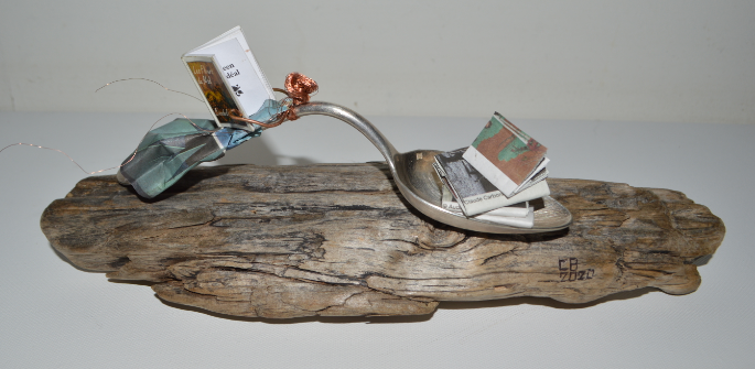Ce travail non exhaustif, est parti d’une démarche « écoresponsable» où l’utilisation des matériaux abandonnés, promis au rebut m’a permis de tordre quelques expressions pour aboutir à des œuvres constituées de bois flotté, fil de fer, ancienne pendule et pièce de monnaie, cuillère en argent, mètre ruban, corde de guitare usagées….