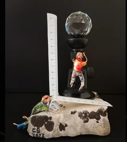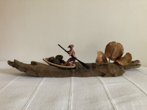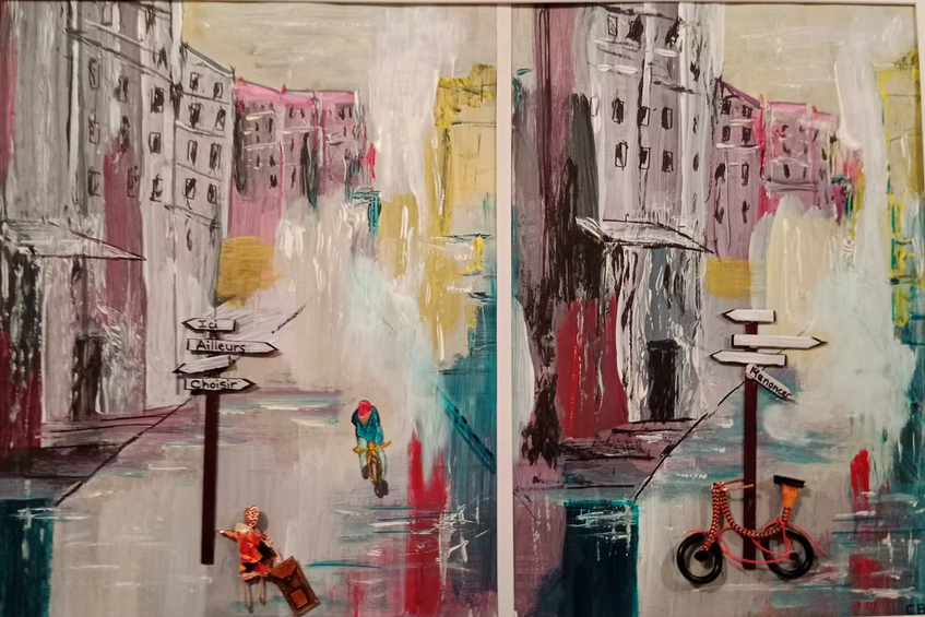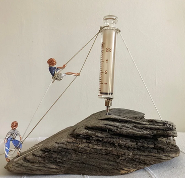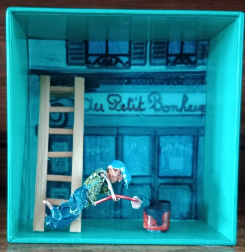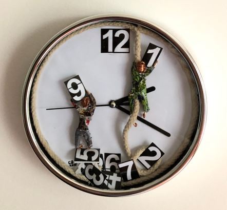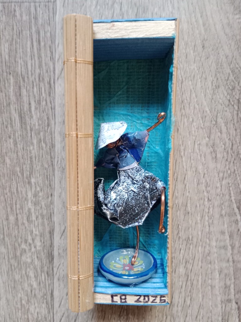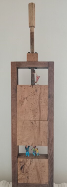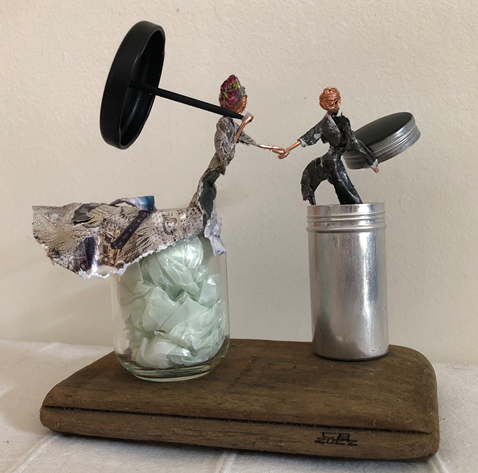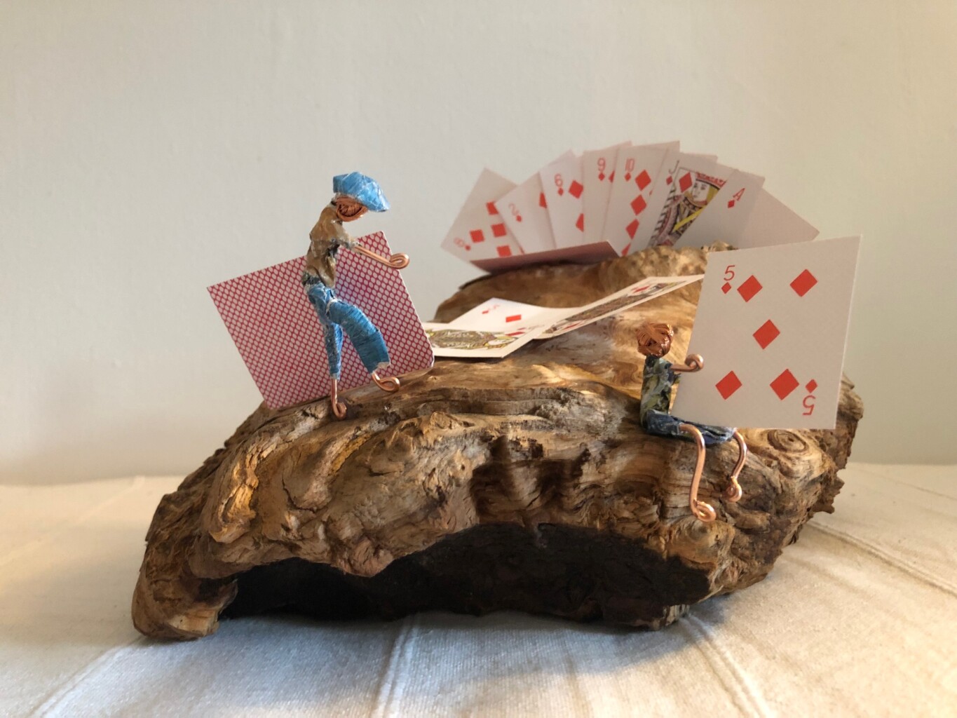 Ce travail non exhaustif, est parti d’une démarche « écoresponsable» où l’utilisation des matériaux abandonnés, promis au rebut m’a permis de tordre quelques expressions pour aboutir à des œuvres constituées de bois flotté, fil de fer, ancienne pendule et pièce de monnaie, cuillère en argent, mètre ruban, corde de guitare usagées….