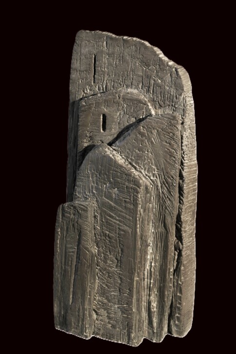 La forme de la sculpture, masse verticale tendue vers le ciel, aux parois comme écrasées par un compresseur, appelle à la prière.