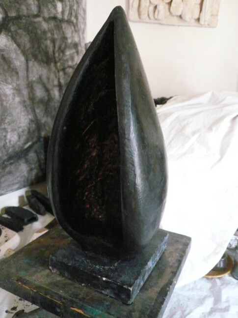 La sculpture est en terre de grosse chamotte, en Grès d’Irak. Elle a été cuite à haute température, et patinée ensuite par mes soins. Son aspect est volontairement brut et sombre. De son obscurité, elle puise cependant une lumière vive, qui est un cri d’espoir. Puissant et silencieux.